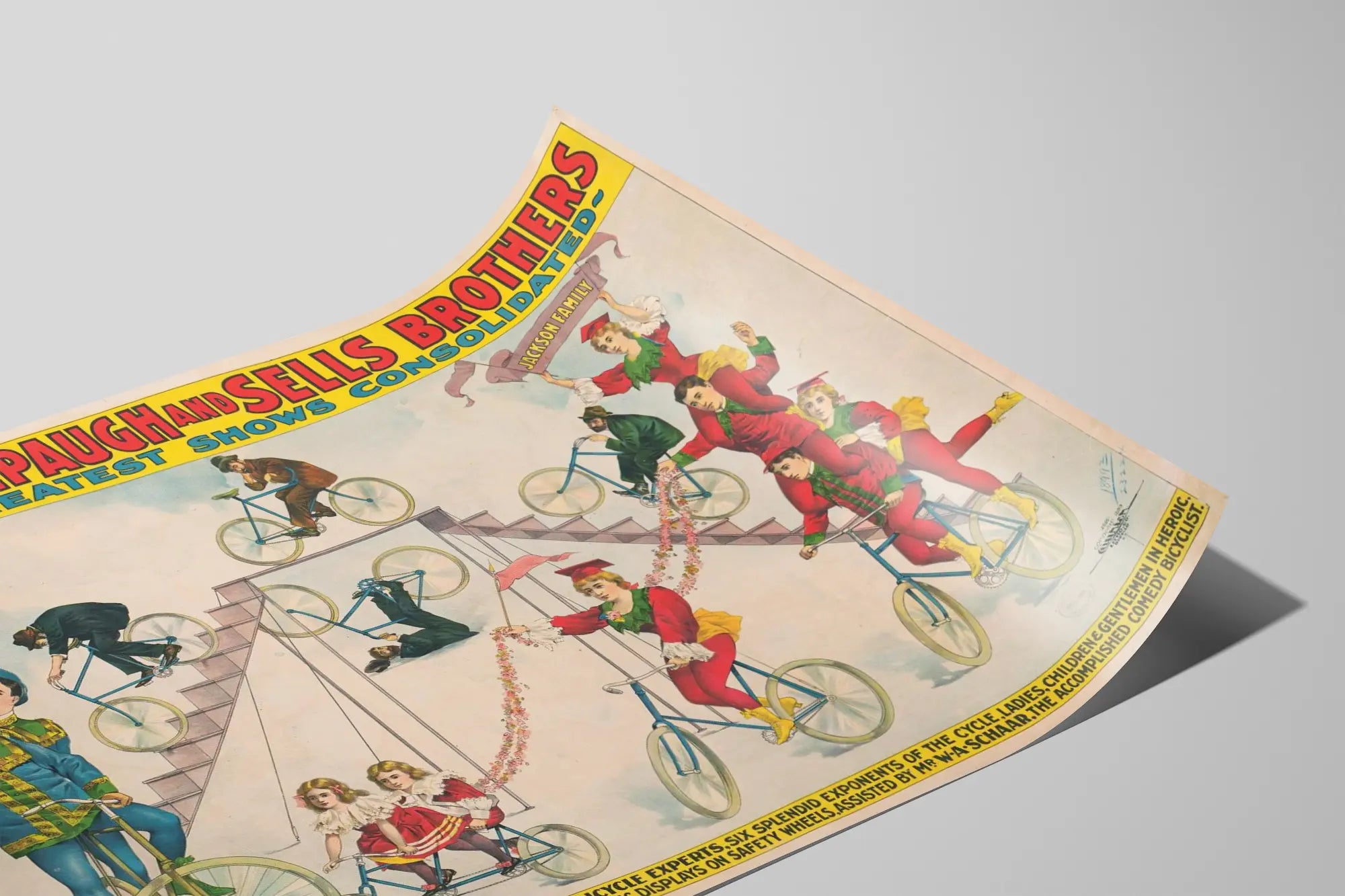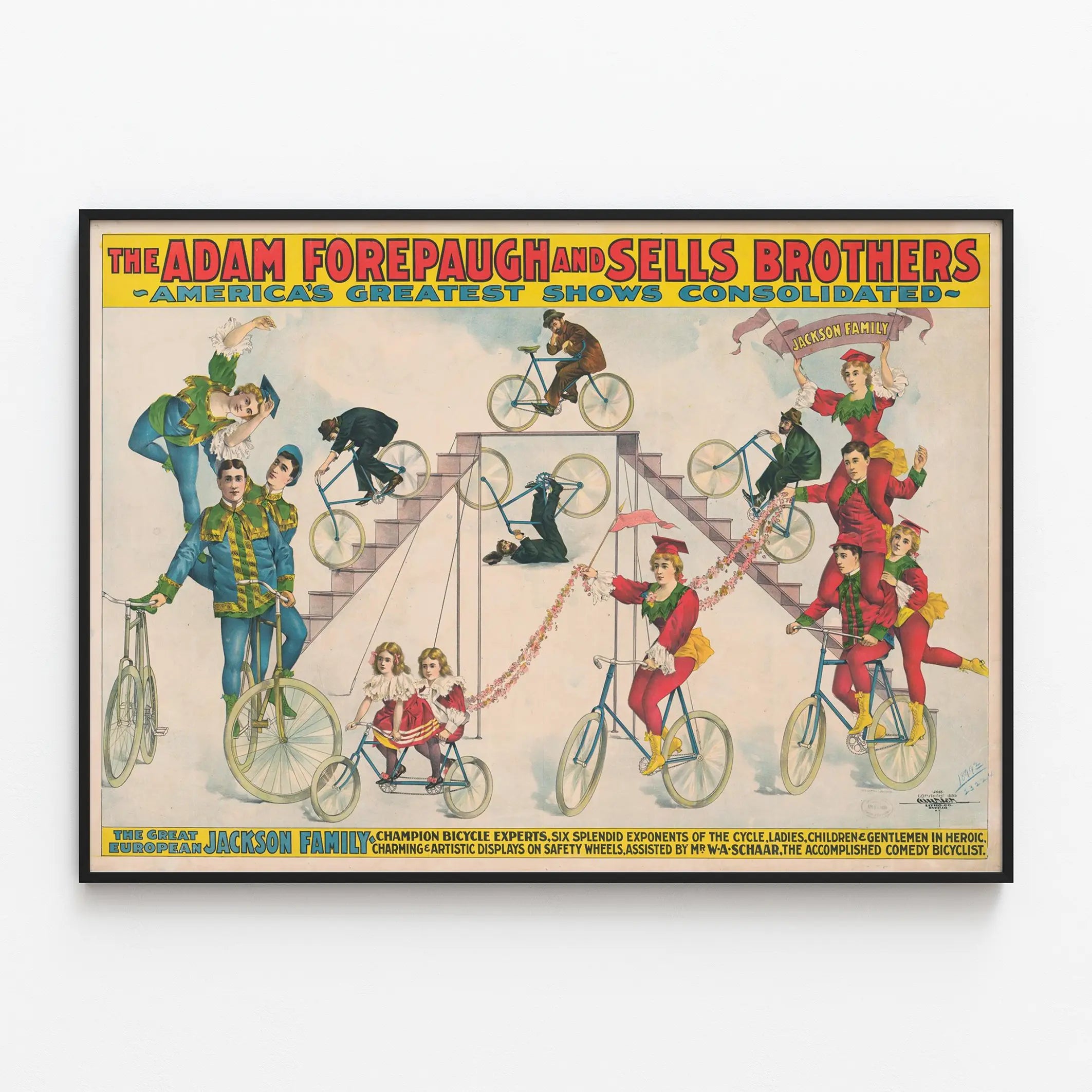 Entdecken Sie dieses großartige Vintage-Poster, das The Adam Forepaugh and Sells Brothers zeigt, die die größte amerikanische Show mit der berühmten Familie Jackson vereinen. Dieses Plakat, typisch für Zirkus- und Wanderveranstaltungsplakate des späten 19. Jahrhunderts, zeigt eine außergewöhnliche akrobatische Darbietung auf dem Fahrrad. An dieser Wanddekoration können Sie zahlreiche Künstler bewundern, die in bunten Kostümen gekleidet sind und ihr Gleichgewicht sowie athletische Figuren auf Fahrrädern vorführen – ein Beweis für das Talent und die Kreativität jener Zeit. Dieses Wandbild ist perfekt, um Ihrem Zuhause einen retro- und künstlerischen Akzent zu verleihen und die faszinierende Welt alter Shows und Zirkusse zu beschwören. Das Plakat besticht durch lebendige Farben und einen detaillierten grafischen Stil, was es ideal macht als Wanddekoration für Liebhaber von Vintage-Kunst und historischen Show-Szenen. Dieses Wanddekoration-Poster ist eine ausgezeichnete Wahl, um ein Wohnzimmer, Büro oder einen Raum für die Sammlung künstlerischer Objekte individuell zu gestalten, indem es einen authentischen Charme und den Zauber vergangener Zeiten vermittelt. Ein einzigartiges Wandbild, das den Geist der Shows und die Magie der akrobatischen Fahrrad-Performances einfängt und die ästhetische sowie kulturelle Bedeutung dieser Epoche unterstreicht. Perfekt für Sammler oder für diejenigen, die ein altes, stilvolles Poster suchen, das reich an Geschichte und visuellem Schwung ist. Dieses Kunstwerk der Wanddekoration ist eine lebendige Hommage an die Künstler und die Welt der Wander-Show, die eine dynamische und festliche Szene voller Bewegung und Farben präsentiert. Verleihen Sie Ihren Wänden ein Plakat, das eine Geschichte erzählt, das die Präzision alter Illustrationen mit einer fesselnden und nostalgischen Atmosphäre verbindet.