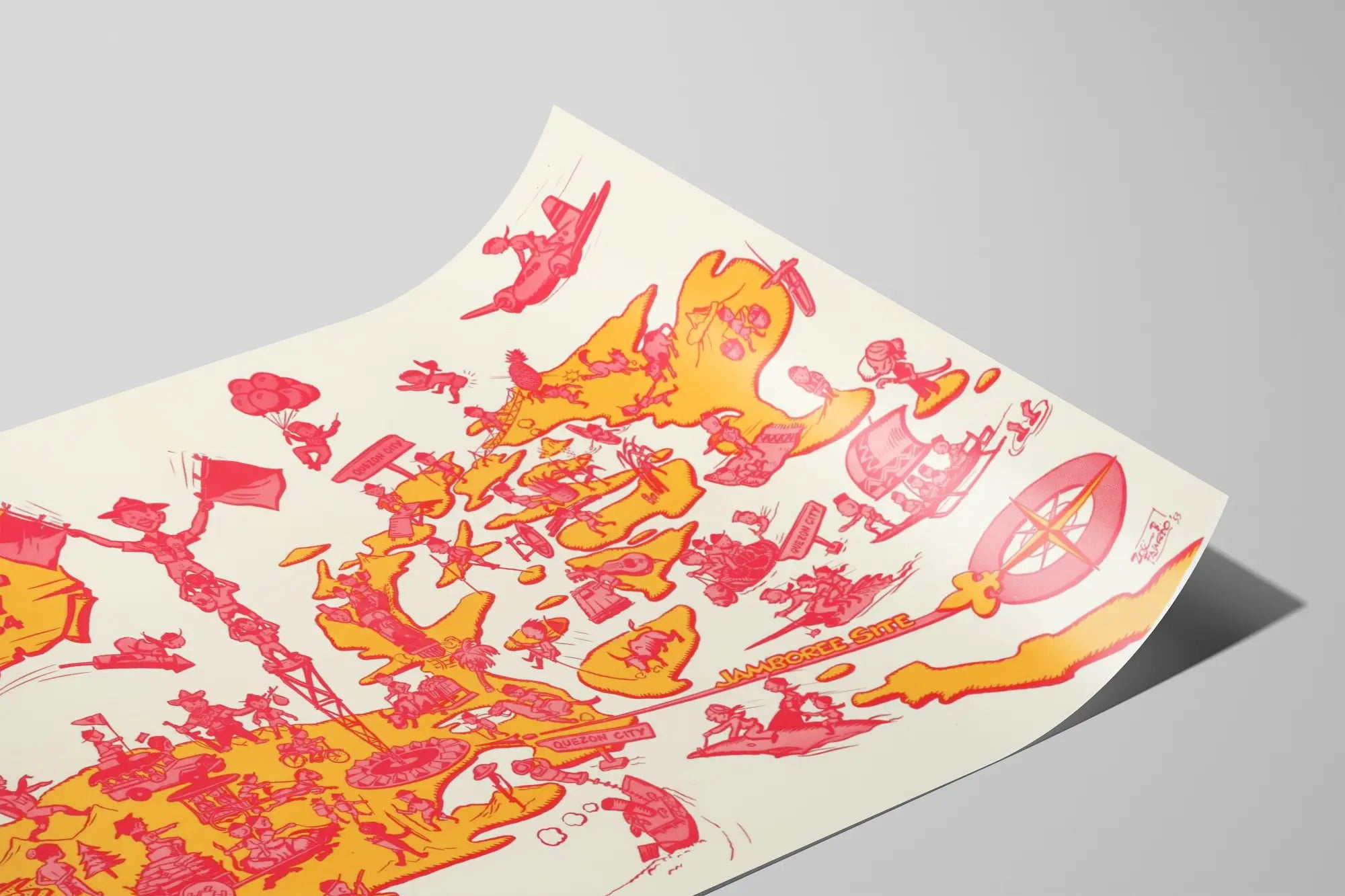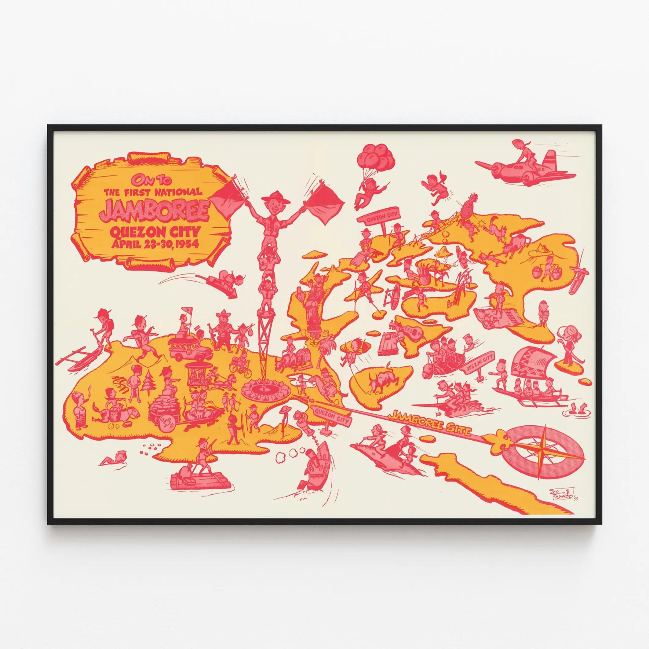 Bringen Sie mit diesem Vintage-Poster mit dem Titel „On To The First National Jamboree“ eine Prise Originalität und Geschichte in Ihr Zuhause. Dieses Plakat zeigt eine lebendige, farbenfrohe Karte in Orange und Rot, die eine Veranstaltung in Quezon City vom 23. bis 30. April 1954 illustriert. Die Karte zeichnet eine stilisierte Region mit zahlreichen kleinen Szenen des Lebens und Aktivitäten, die eine Gruppe von Pfadfindern in Bewegung darstellen – zu Fuß, mit dem Fahrrad, auf Flößen, mit Tieren und sogar in einem Flugzeug. Der Retro-Grafikstil mit klaren Linien und warmen Farben macht es zu einem idealen Wanddekorationselement für Liebhaber von Vintage und verspieltem Design.