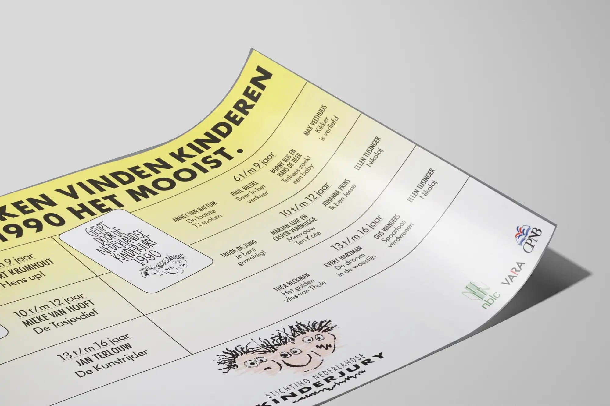 Dieses Vintage-Poster zeigt die Lieblingsbücher der Kinder im Jahr 1990, ausgewählt vom niederländischen Kinderjury. Es ist eine einzigartige Wanddekoration, die sowohl Sammler als auch Liebhaber der Jugendliteratur und des Retro-Designs begeistern wird. Die Komposition ist in vier Abschnitte unterteilt, die bestimmten Altersgruppen entsprechen: 6 bis 9 Jahre, 10 bis 12 Jahre und 13 bis 16 Jahre. Jeder Abschnitt listet die Buchtitel und Autoren auf, die diese Zeit geprägt haben, mit einem hervorgehobenen Feld, das die offizielle Anerkennung durch die Jury betont. Der gelbe Farbverlauf zum Weiß bringt eine helle Note und hebt die kontrastreiche schwarze Typografie hervor. Das Poster enthält außerdem die Logos der niederländischen Organisationen, die mit Jugendliteratur verbunden sind, was seine Authentizität und seinen Vintage-Charme unterstreicht. Als Poster oder dekoratives Bild verwendbar, findet es seinen idealen Platz in einem Kinderzimmer, einer Bibliothek oder einem Leseecke. Sein schlicht und klar gestalteter grafischer Stil hebt eine bedeutende Periode der niederländischen Kinderliteratur hervor und macht dieses Stück zu einem dekorativen Element voller Geschichte und Kultur. Die Liste der präsentierten Autoren und Werke bietet einen wertvollen Einblick in die literarischen Vorlieben der jungen Generationen jener Zeit und verleiht Ihrer Wanddekoration eine Prise Originalität und Authentizität.
