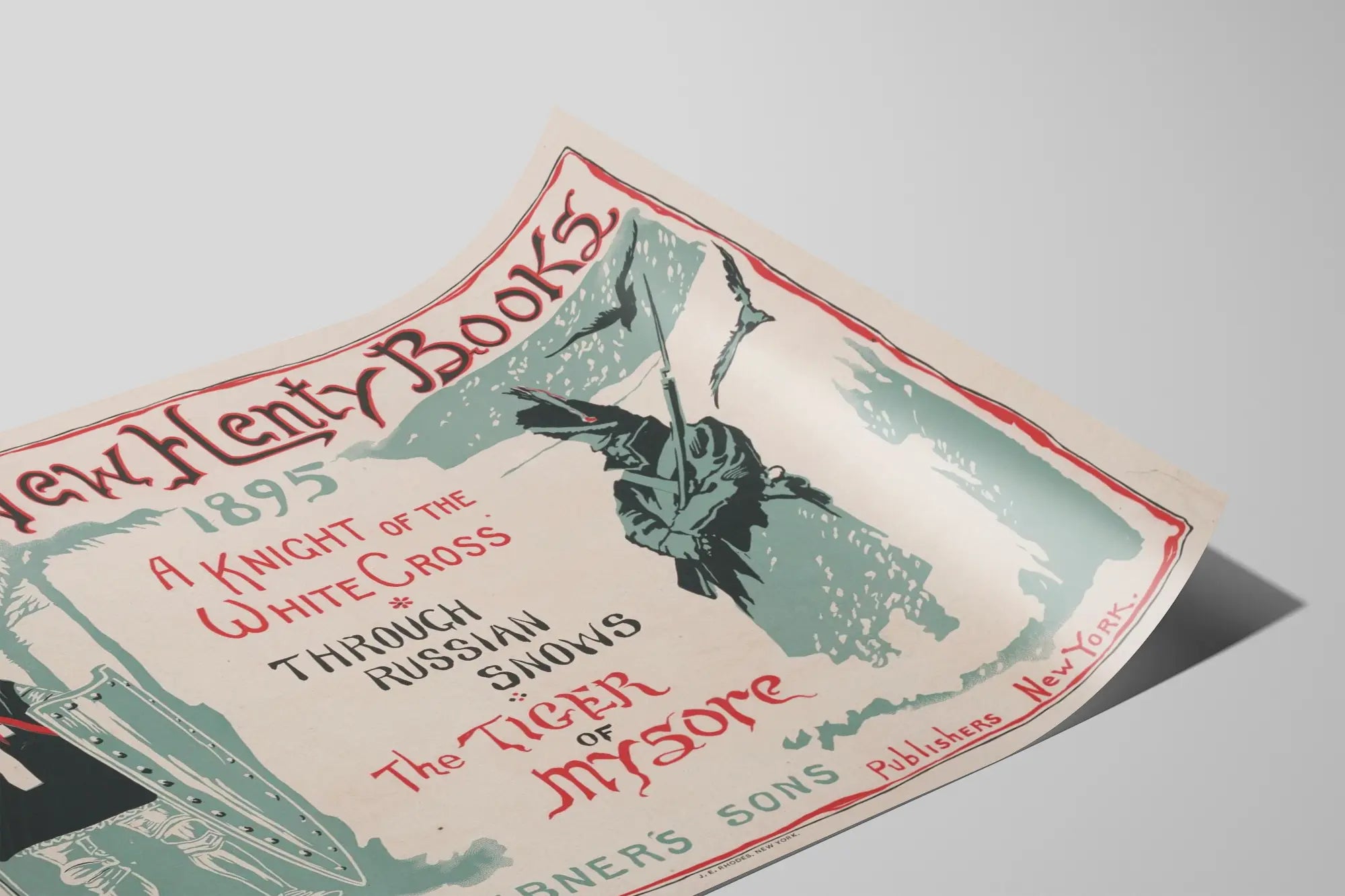 Entdecken Sie dieses einzigartige Vintage-Poster mit dem Titel "Drei Neue Henty-Bücher" aus dem Jahr 1895, ein bemerkenswertes Stück für jede Wanddekoration im Retro- und Literaturstil. Dieses Plakat hebt drei ikonische Titel hervor: "A Knight of the White Cross", "Through Russian Snows" und "The Tiger of Mysore". Mit zwei Hauptfiguren, die den Text einrahmen, kunstvoll illustriert, verbindet diese Wanddekoration geschickt Nuancen von Rot, Grau und Schwarz auf hellem Hintergrund und verleiht Ihrem Interieur einen Hauch von Authentizität und altem Charme.