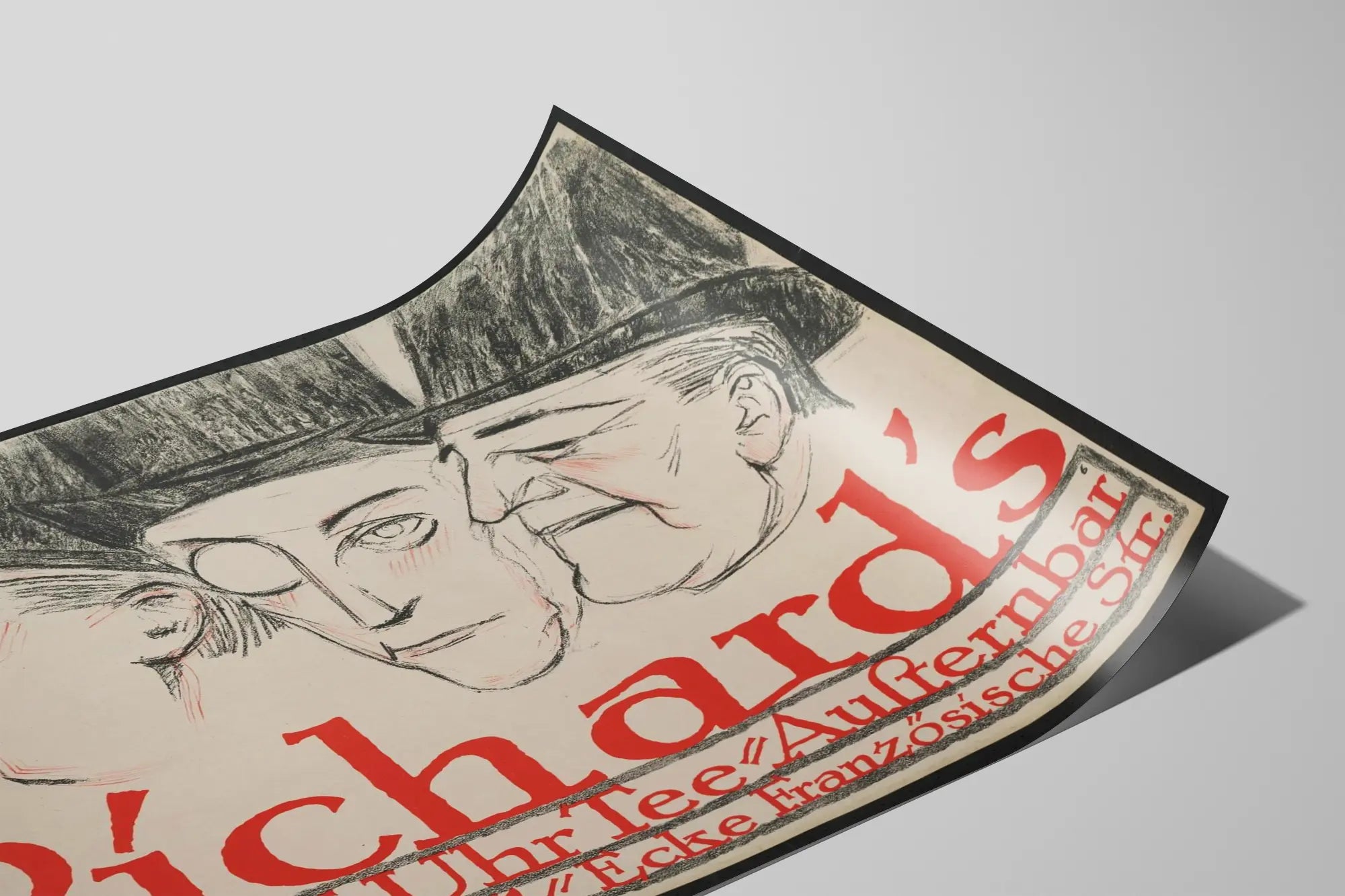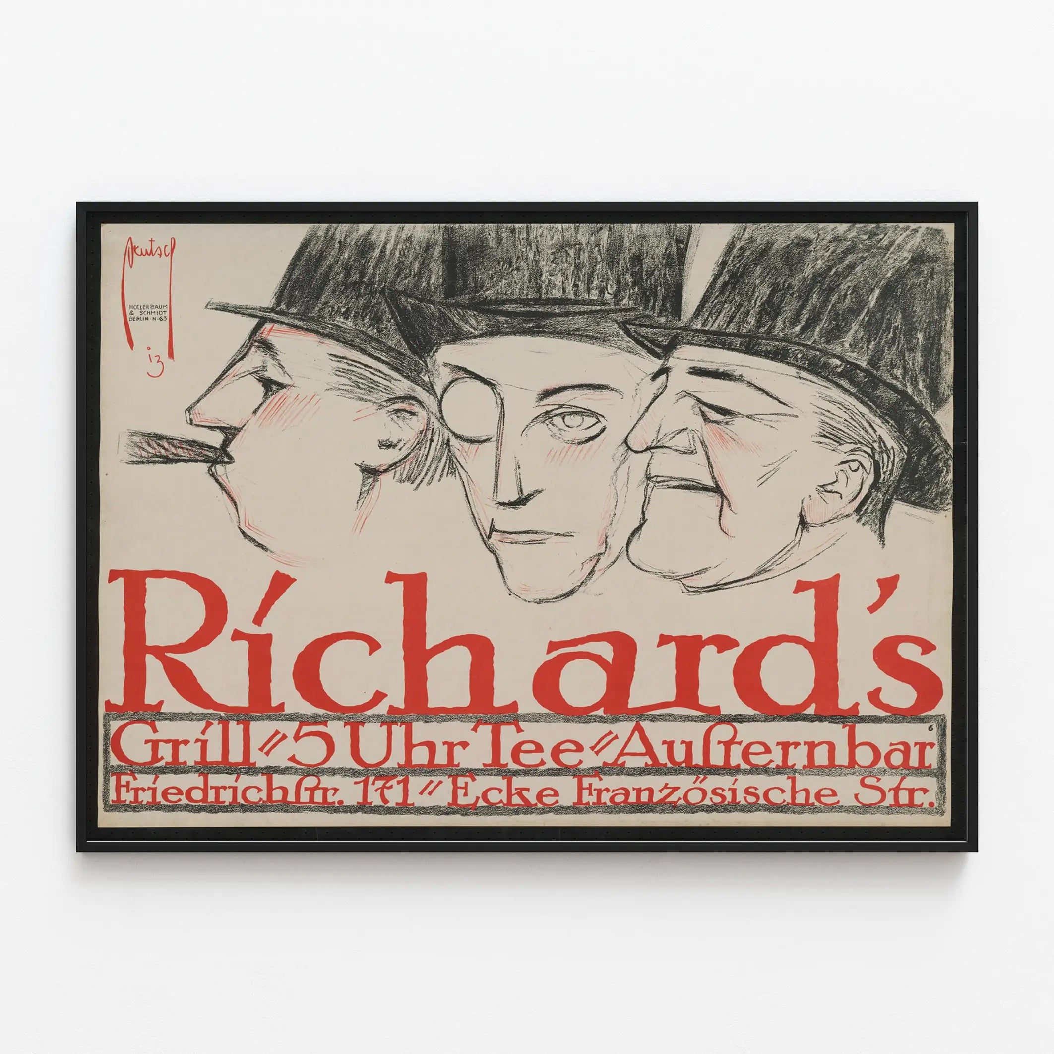 Dieses Vintage-Poster von Richards Grill ist ein einzigartiges Wanddekorationselement, das Ihrem Interieur eine Note von Authentizität und Charakter verleiht. Es zeigt drei fein gezeichnete Gesichter mit Bleistift, begleitet von breiten Hüten, und verwendet eine schlichte Farbpalette, die von Schwarz, Rot und Grautönen dominiert wird. Der grafische Stil ist ausdrucksstark, verbindet präzise Linien mit subtilen Schattierungen, die diesen detaillierten Porträts Leben einhauchen, wobei die Wangen mit roten Akzenten hervorgehoben sind. Der rote Text am unteren Rand des Posters, in altertümlicher Schriftart, gibt die Informationen eines Ortes namens Richards Grill mit Adresse an, was der Komposition einen historischen und kulturellen Charakter verleiht. Dieses Wandbild ist ideal für Liebhaber grafischer Kunst und Vintage-Dekorationen und schafft eine retro-elegante Atmosphäre in Wohnzimmer, Büro oder Empfangsbereich. Es fügt sich perfekt in eine thematische Wanddekoration im Stil des frühen 20. Jahrhunderts ein oder in urbane und industrielle Umgebungen. Dieses Wanddekoration-Poster ist ein markantes Element, das durch seinen Farbkontrast und seinen einzigartigen grafischen Stil Aufmerksamkeit erregt und jeden Raum, den es schmückt, zu einem Ort voller Geschichte und künstlerischer Eleganz macht.