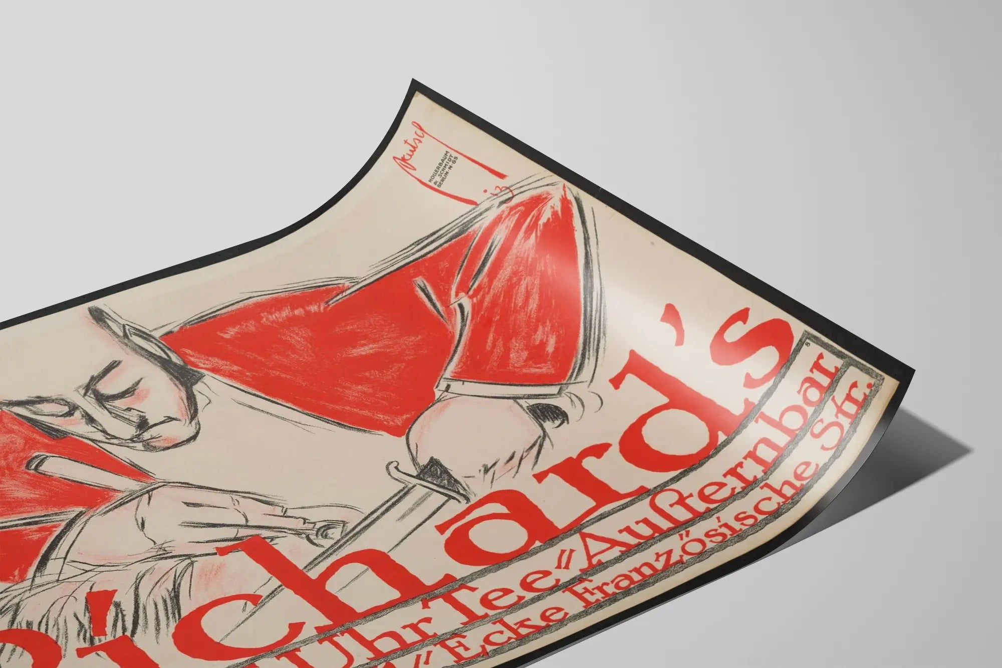 Der leuchtend rote Schriftzug „Richards“ nimmt eine zentrale Position ein und betont die werbende und retroartige Seite des Posters. Direkt darunter ergänzen Informationen in Deutsch wie „Grill“ und „5 Uhr Tee“ seine Authentizität und den Charme vergangener Zeiten, die einen Treffpunkt und Geselligkeit symbolisieren. Dieses Poster eignet sich perfekt für Liebhaber von Wanddekoration im Retro-, Kunst- oder Industrie-Stil und verleiht einer Wand Eleganz und Originalität.