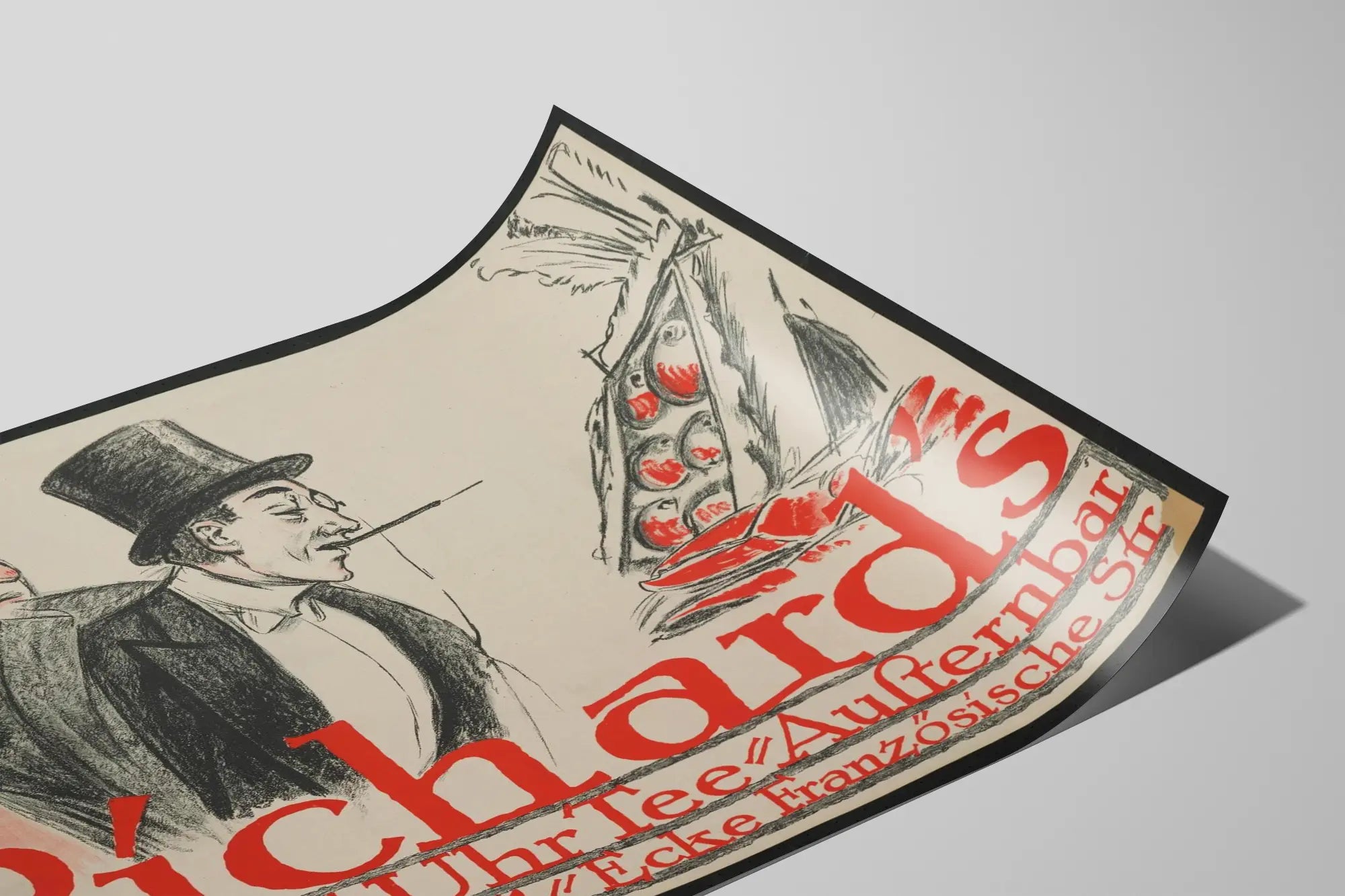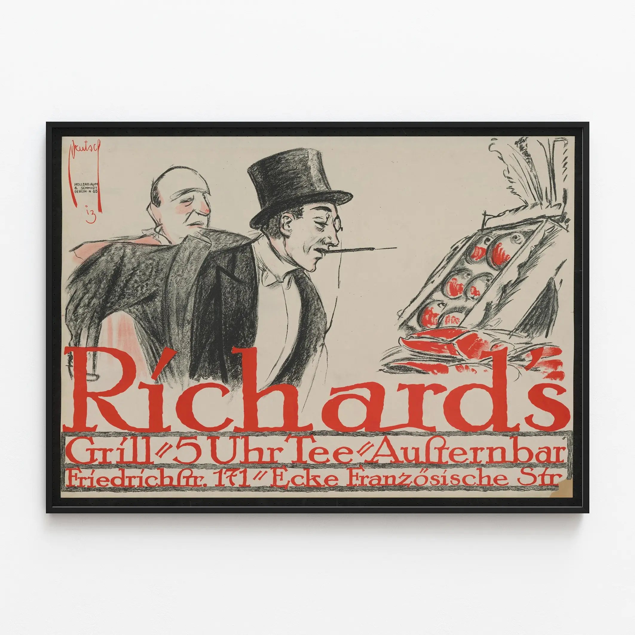 Dieses Poster spielt geschickt mit typografischen und ikonografischen Elementen, mit dem Namen „Richards“ in großen roten Buchstaben sowie Details zur Adresse und Uhrzeit („Grill 5 Uhr Tee Austernbar Friedrichstraße 171 Ecke Französische Straße“), die sowohl einen Hauch alter Werbung als auch eine historische Dimension verleihen. Die Szene stellt wahrscheinlich einen geselligen Ort dar, einen Grill oder Austernbar, und evoziert eine urbane, festliche Atmosphäre vergangener Zeiten.