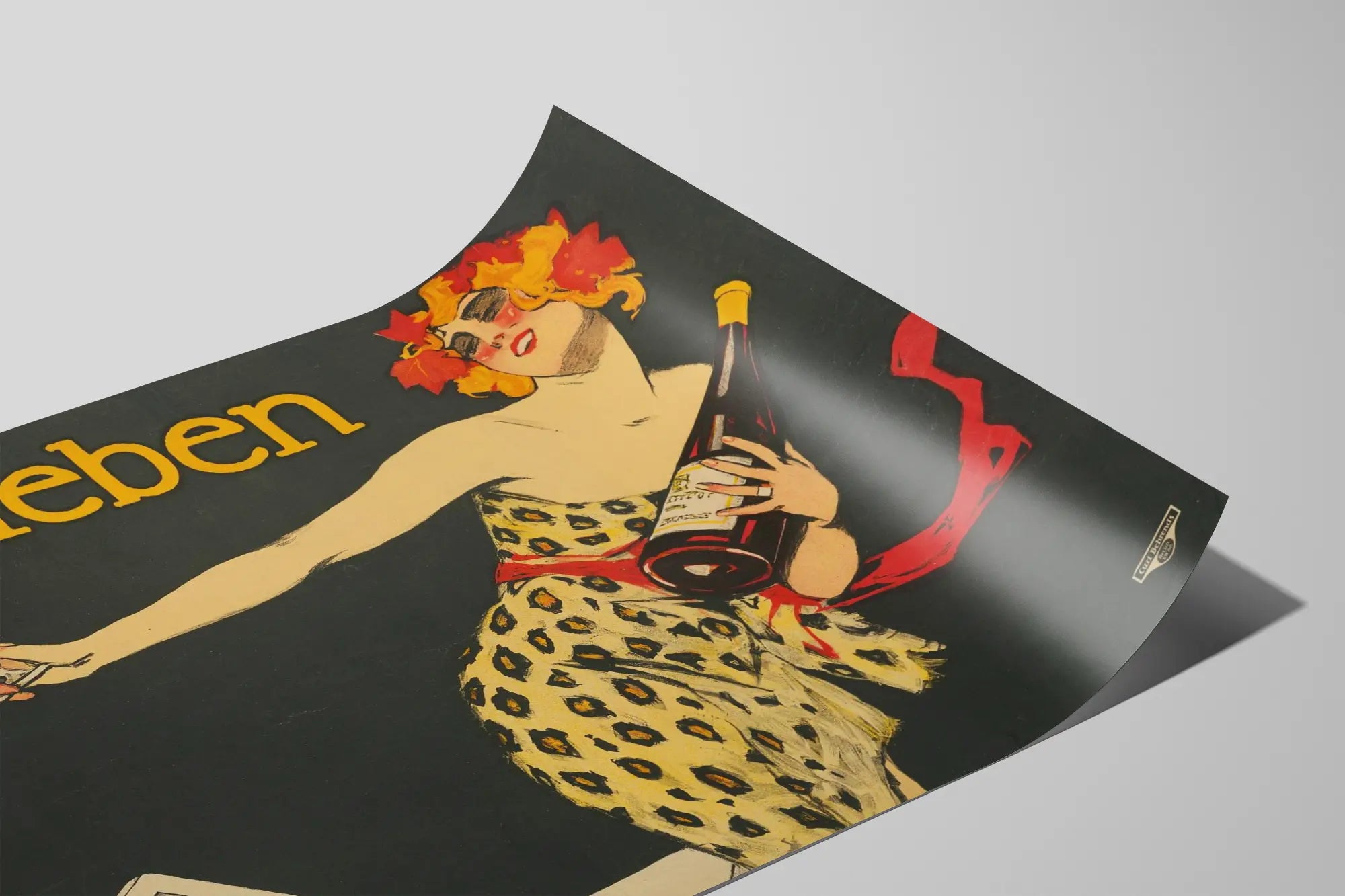 Dieses Vintage-Poster von Schlieben verleiht Ihrer Wanddekoration einen Hauch von Eleganz und nostalgischem Charme. In einem alten grafischen Stil dargestellt, zeigt es eine Frau in einem Leopardenmuster-Kleid, die eine große Weinflasche und ein Glas in der Hand hält, in einer festlichen und fröhlichen Atmosphäre. Die warmen, gesättigten Farben, dominiert von Gelb- und Rottönen auf dunklem Hintergrund, verleihen diesem Plakat eine dynamische und ansprechende Ausstrahlung, die den Blick auf sich zieht. Sein typischer Stil des frühen zwanzigsten Jahrhunderts macht dieses Poster zur idealen Wahl für eine Inneneinrichtung, die eine nostalgische und künstlerische Stimmung sucht – zugleich elegant und lebendig. Ob Sie ein Wohnzimmer, eine Küche oder eine Bar dekorieren möchten, dieses Poster ist ein unverzichtbares Wanddekorationselement. Seine ausgewogene Komposition und seine ausdrucksstarken Details machen es zu einem Blickfang, der die Atmosphäre in jedem Raum aufwertet. Mit diesem grafischen Kunstwerk für Ihre Dekoration wählen Sie einen klassischen visuellen Stil, der Geselligkeit und Freude durch eine fröhliche, farbenfrohe Darstellung vermittelt. Dieses Schlieben-Poster ist perfekt für Liebhaber vintage Wanddekorationen und Enthusiasten alter Grafiken, die ihr Zuhause mit einem Hauch von Authentizität und Fröhlichkeit bereichern möchten. Verleihen Sie Ihren Wänden eine zeitlose künstlerische Note mit diesem dekorativen Poster, das durch seinen nostalgischen Charme und seine starke Persönlichkeit besticht.