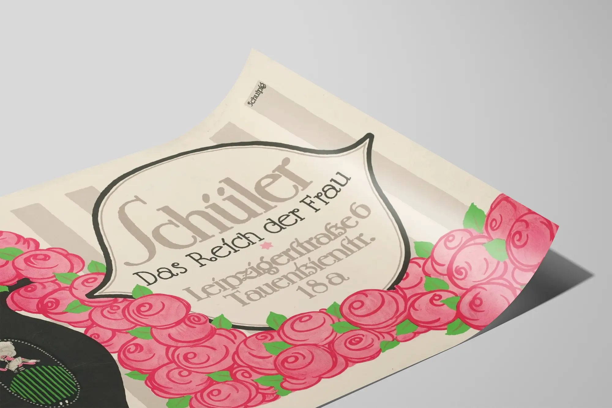 Dieses Vintage-Poster Schuler Das Reich der Frau ist ein einzigartiges Wanddekorationselement, das in jedem modernen oder retro-inspirierten Interieur für Aufsehen sorgt. Gekrönt wird es von einer stilisierten schwarzen Vase, die mit einem Strauß leuchtend rosa Rosen überquillt. Dieses Bild zieht sofort die Aufmerksamkeit durch seinen Farbkontrast und seine elegante Komposition auf sich. Die um die Vase gewundenen Blumen verleihen eine Note von Sanftheit und Romantik, perfekt für eine freundliche und warme Atmosphäre. Der Hintergrund zeigt dezente vertikale Streifen in Beigetönen, die die grafischen Elemente hervorheben, ohne abzulenken. Rechts neben der Illustration umrahmt eine Textblase den Namen „Schuler Das Reich der Frau“, begleitet von einer im Vintage-Stil geschriebenen Adresse, was den Charme des Posters unterstreicht. Diese Art der Wanddekoration richtet sich besonders an Liebhaber grafischer Kunst des frühen 20. Jahrhunderts oder an jene, die eine florale und feminine Atmosphäre in ihrem Wohnraum schaffen möchten. Dieses Poster eignet sich ideal zur Dekoration von Wohnzimmern, Schlafzimmern oder Leseecken und verleiht einen Hauch von alter Eleganz und visueller Leichtigkeit. Es lässt sich auch gut in einen eklektischen Stil integrieren, der antike Objekte mit zeitgenössischen Elementen verbindet, um einen einzigartigen Eindruck zu hinterlassen. Die Farbpalette, die lebhaftes Rosa, tiefes Schwarz, sanftes Beige und grüne Akzente vereint, sorgt für eine harmonische Farbgestaltung, die sich leicht in verschiedene Wandstile einfügt, egal ob hell oder dunkel. Als dekoratives Element stellt dieses Poster eine gelungene Verbindung zwischen grafischer Kunst und floristischer Illustration dar, ideal, um eine weiße oder pastellfarbene Wand zu bereichern und gleichzeitig einen Hauch künstlerischer Nostalgie zu vermitteln. Ob gerahmt in einem feinen schwarzen Rahmen oder einfach auf einem Regal platziert – dieses Vintage-Poster Schuler Das Reich der Frau wird die Aufmerksamkeit auf sich ziehen und Gespräche anregen. Es richtet sich sowohl an Sammler alter Poster als auch an Liebhaber raffinierter und detaillierter Wanddekorationen. Bringen Sie einen Hauch von Charme und Raffinesse in Ihr Zuhause mit diesem Poster voller großzügiger Rosen und originalem Retro-Stil.
