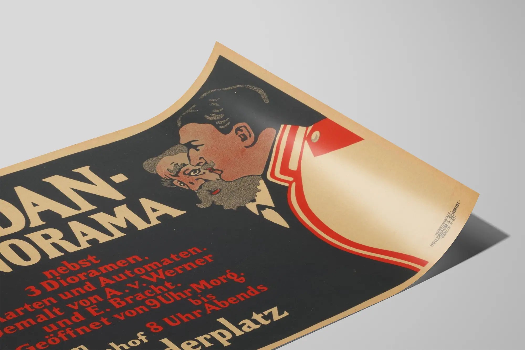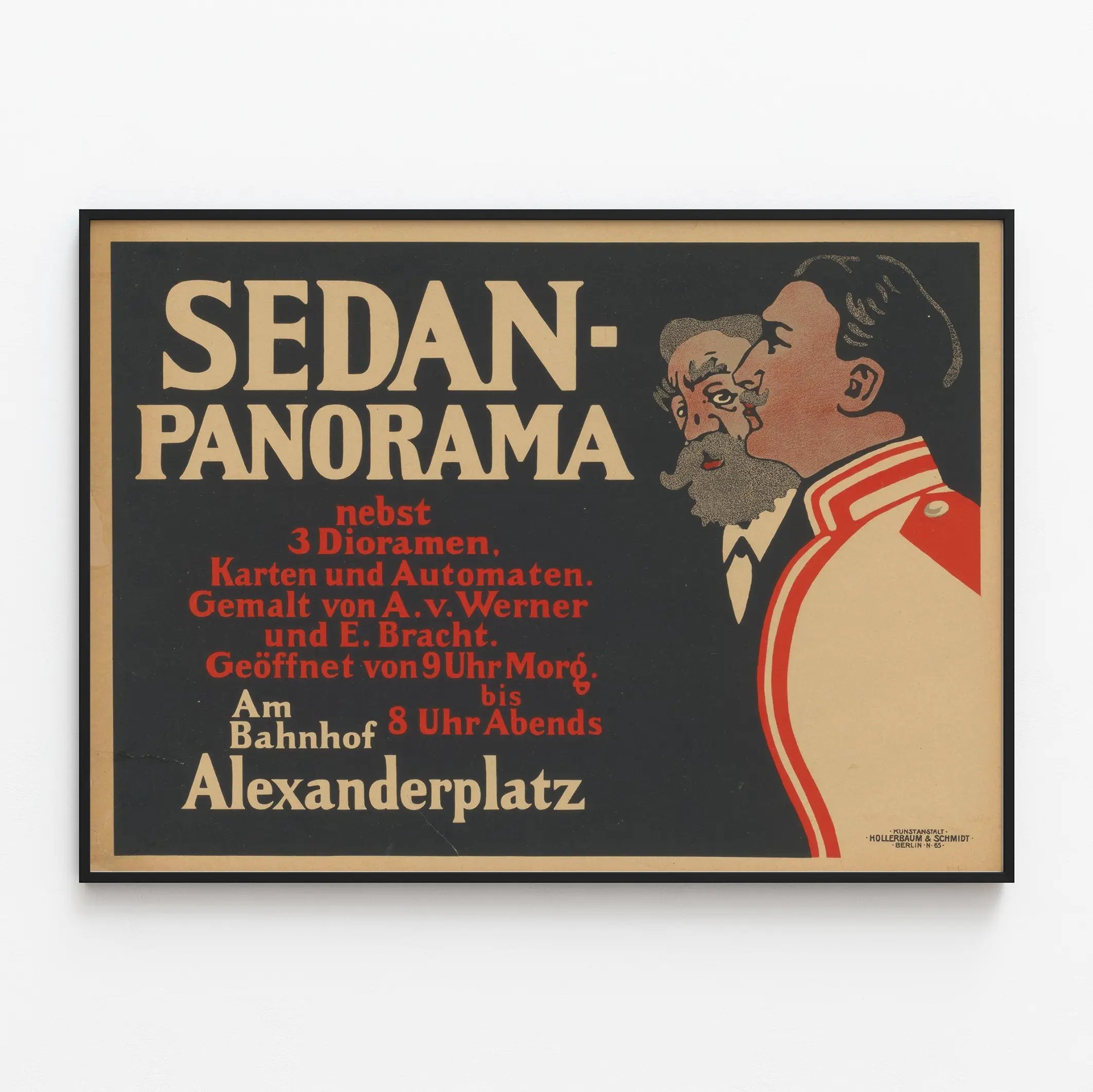 Entdecken Sie dieses Vintage-Poster mit dem Titel „Sedan Panorama“, ein einzigartiges Wanddekorationselement, das Ihrem Interieur einen nostalgischen Charme und einen Hauch von Geschichte verleiht. Dieses Poster zeichnet sich durch ein schlichtes Design und eine zurückhaltende Farbpalette aus, in der Schwarz, Beige und leuchtendes Rot dominieren. Der deutsche Text nimmt eine zentrale Rolle in der Komposition ein und hebt den Namen „Sedan-Panorama“ in großen beigen Buchstaben hervor, die sich deutlich vor einem tiefschwarzen Hintergrund abheben. Rechts daneben sind zwei illustrierte Profile zu sehen: ein Mann mit Bart und markanten Zügen sowie eine weitere Figur in rotem und weißem Uniform, die eine historische und militärische Atmosphäre evoziert.