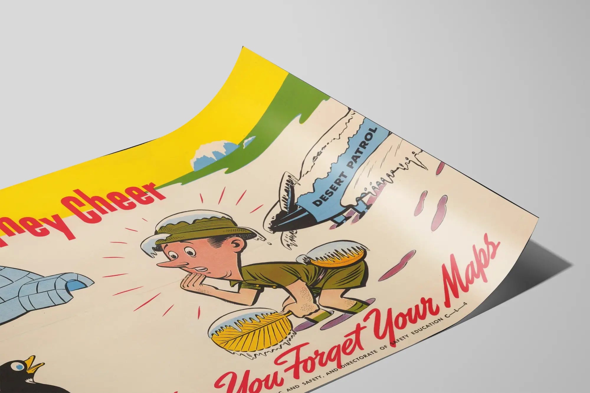 Ideal für Liebhaber retro Grafikdesigns, alter Plakatkunst oder für diejenigen, die ihrer Inneneinrichtung eine humorvolle und originelle Note verleihen möchten, ist dieses Poster „They Cheer When You Forget Your Maps“ eine mutige und stilvolle Dekorationswahl.