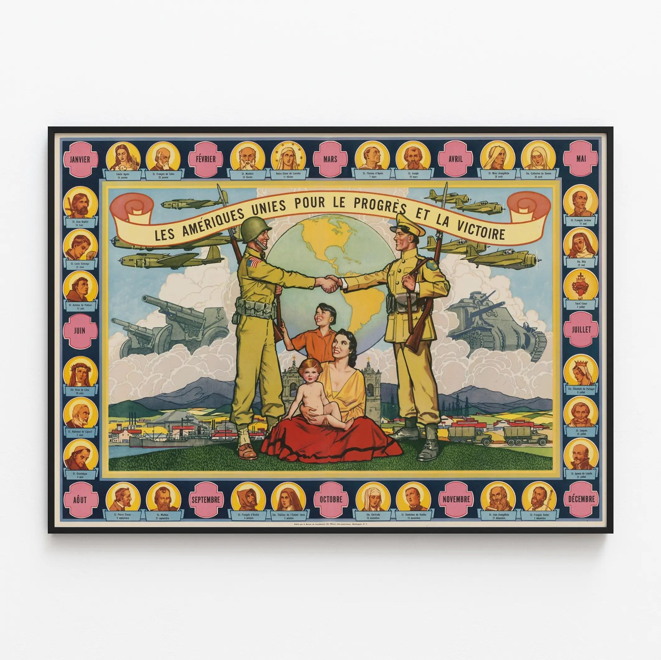 Verleihen Sie Ihrem Zuhause mit diesem Wandposter, das die Vereinigung der Amerikas im Geist des Fortschritts und Sieges darstellt, eine einzigartige dekorative Note. Eine perfekte Wahl, um eine Wand mit einem starken, bedeutungsvollen Bild zu bereichern, das sowohl historische und kulturelle Bedeutung trägt als auch einen klassischen, vintage Dekorationsansatz unterstreicht.