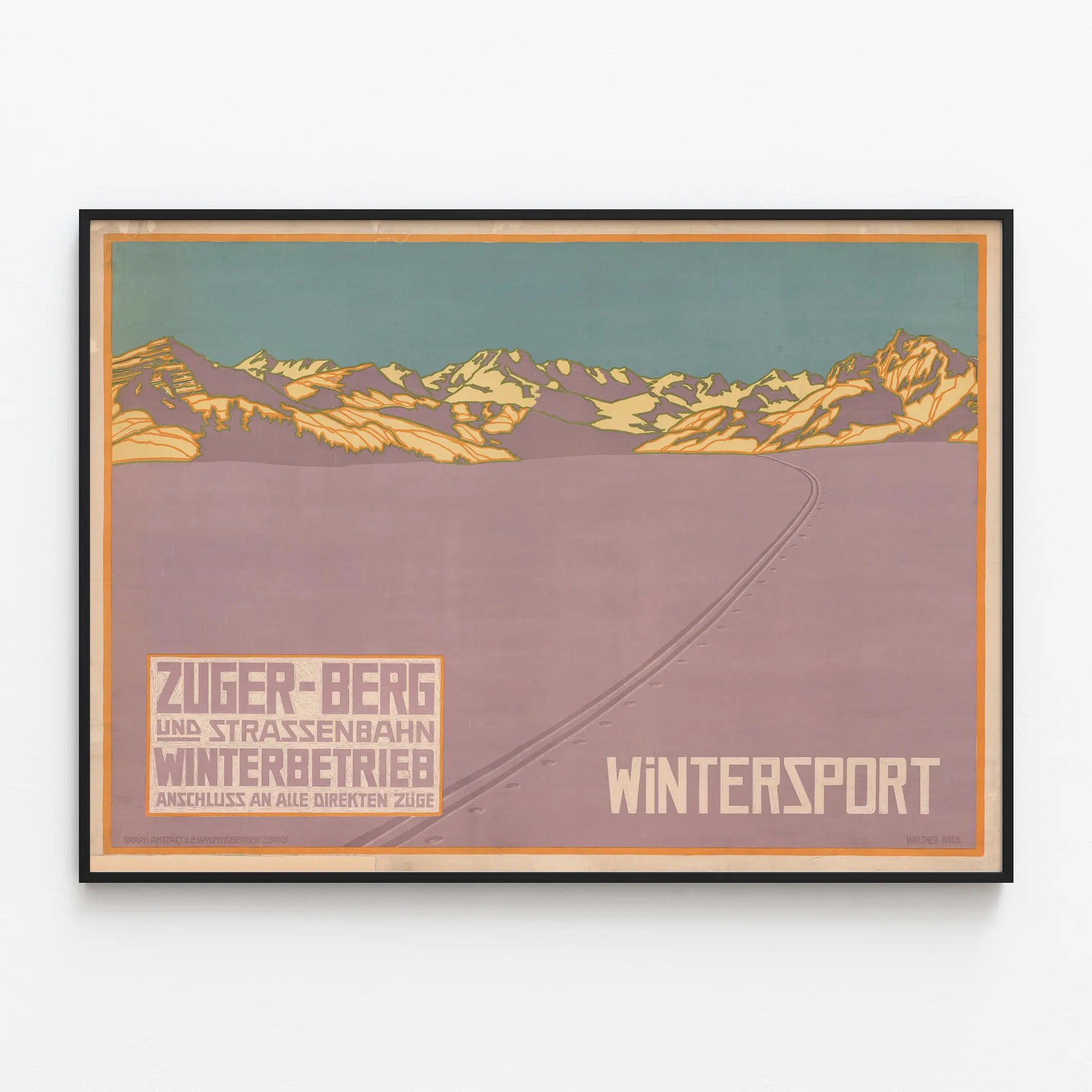 Dieses Vintage-Poster Zuger-Berg und Straßenbahn Winterbetrieb ist ein ideales Wanddekorationselement für Liebhaber von Wintersportarten und alpinen Landschaften. Seine grafische Gestaltung hebt eine weite verschneite Fläche im Vordergrund hervor, geprägt von Fußspuren und einer Piste, die sanft zu stilisierten Bergen im Hintergrund führt. Die Farbpalette, dominiert von pastellfarbenen Tönen in Violett, Blau und Creme, schafft eine beruhigende und kühle Atmosphäre, typisch für winterliche Szenen. Die Berge mit ihren schneebedeckten Gipfeln und vereinfachten Formen erinnern an eine Winterlandschaft, die zum Skifahren und anderen Wintersportarten einlädt, und verstärken das Thema „Wintersport“, das in markanten geometrischen Buchstaben geschrieben ist. Der deutsche Text im unteren linken Bereich bezieht sich auf den Zuger-Berg und die Winterstraßenbahn, was auf einen Spaziergang oder einen erleichterten Zugang zu winterlichen Freizeitorten hinweist – eine Idee, die perfekt zu diesem Werbeplakat passt. Dieses Poster verbindet die Eleganz des Retro-Designs mit einer direkten Verbindung zur Natur und sportlicher Aktivität im Freien. Es fügt sich harmonisch in eine vintage Wanddekoration ein, sei es im Wohnzimmer, Eingangsbereich oder in einem Raum für Bergleidenschaften. Dieses Wandbild weckt sowohl die Nostalgie alter Schweizer Werbeanzeigen als auch den aktiven Geist des Wintersports und verleiht Ihrem Zuhause eine originelle und künstlerische Note. Verleihen Sie Ihren Wänden eine elegante, zeitlose Bergatmosphäre mit diesem Zuger-Berg-Poster, ideal für Liebhaber authentischer Wanddekorationen und alle, die verschneite Landschaften und Winterabenteuer schätzen.