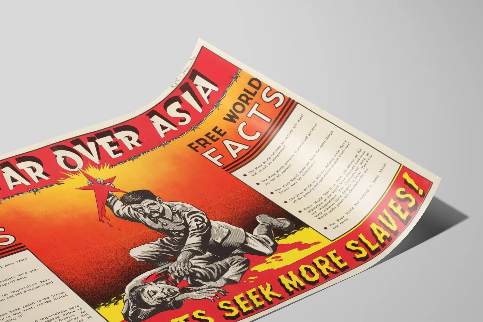 Dieses vintage Plakat im markanten grafischen Stil zeigt eine starke politische Botschaft und illustriert einen symbolischen Kampf zwischen zwei gegensätzlichen Welten. Mit einem verlaufenden Hintergrund in Rot und Orange trägt diese Wanddekoration den Titel „Roter Stern über Asien“ und zeigt eine dramatische Darstellung, bei der eine männliche Figur einen blutbefleckten roten Stern über einer am Boden liegenden Person hält, was eine Botschaft von Konflikt und Unterdrückung verstärkt. Dieses Poster teilt seinen Inhalt visuell in zwei Bereiche namens „Sklavenwelt Fakten“ und „Freie Welt Fakten“, um die ideologischen Unterschiede zwischen der kommunistischen Welt und der freien Welt hervorzuheben. Die Ästhetik dieses Plakats verkörpert den Propagandastil der Zeit des Kalten Krieges, mit kühnen Schriftarten und leuchtenden Farben, die die Aufmerksamkeit auf sich ziehen. Ein Stacheldraht verläuft horizontal im oberen Bereich und verstärkt das Thema Gefangenschaft und Kampf. Dieses Plakat ist ein bemerkenswertes Wanddekorationselement für Liebhaber politischer Geschichte, Retro-Grafik oder Sammler alter Plakate. Es verleiht jedem Raum eine intensive und erzählerische Atmosphäre und kann als gerahmtes Poster oder dekoratives Bild verwendet werden, um eine Wand im Vintage-Stil mit symbolischer Bedeutung zu verschönern. Der hohe Kontrast und die klare Komposition machen es zu einem dekorativen Element, das zum Nachdenken und Austausch anregt – ideal für Umgebungen, die Kultur oder historische Debatten widmen.