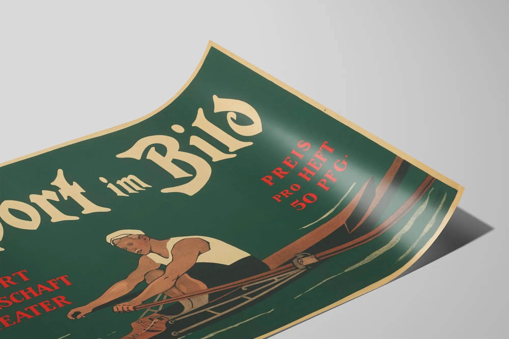 Dieses Vintage-Poster mit dem Titel „Sport im Bild“ ist ein einzigartiges Wanddekorationselement, das einen Ruderer in voller Aktion zeigt. Mit einem dunkelgrünen Hintergrund und Inschriften in alten weißen und roten Buchstaben vermittelt dieses Poster eine subtile Verbindung zwischen Sport, Gesellschaft und Theater. Das zentrale Motiv dieser Wanddekoration ist ein Mann in traditioneller Ruderbekleidung, dargestellt in einem grafischen Stil, der an die Poster der ersten Jahrzehnte des 20. Jahrhunderts erinnert. Die dezenten, aber kontrastreichen Farben verstärken den Retro- und Eleganzcharakter, was es zu einem perfekten Poster für alle macht, die ihrem Interieur eine sportliche und künstlerische Note verleihen möchten. Ideal für Sport- und Vintage-Enthusiasten passt dieses Poster sowohl in ein Fitnessstudio als auch in ein Wohnzimmer oder Büro. Seine alte Typografie und die schlichten Motive machen es zu einem faszinierenden dekorativen Kunstobjekt, das Geschichte erzählt. Ob für eine Sammlung sportlicher Poster oder zur Dekoration eines Raumes, der Bewegung und Leistung gewidmet ist – dieses Vintage-Ruderer-Poster ist ein originelles und zeitloses Dekorationselement.