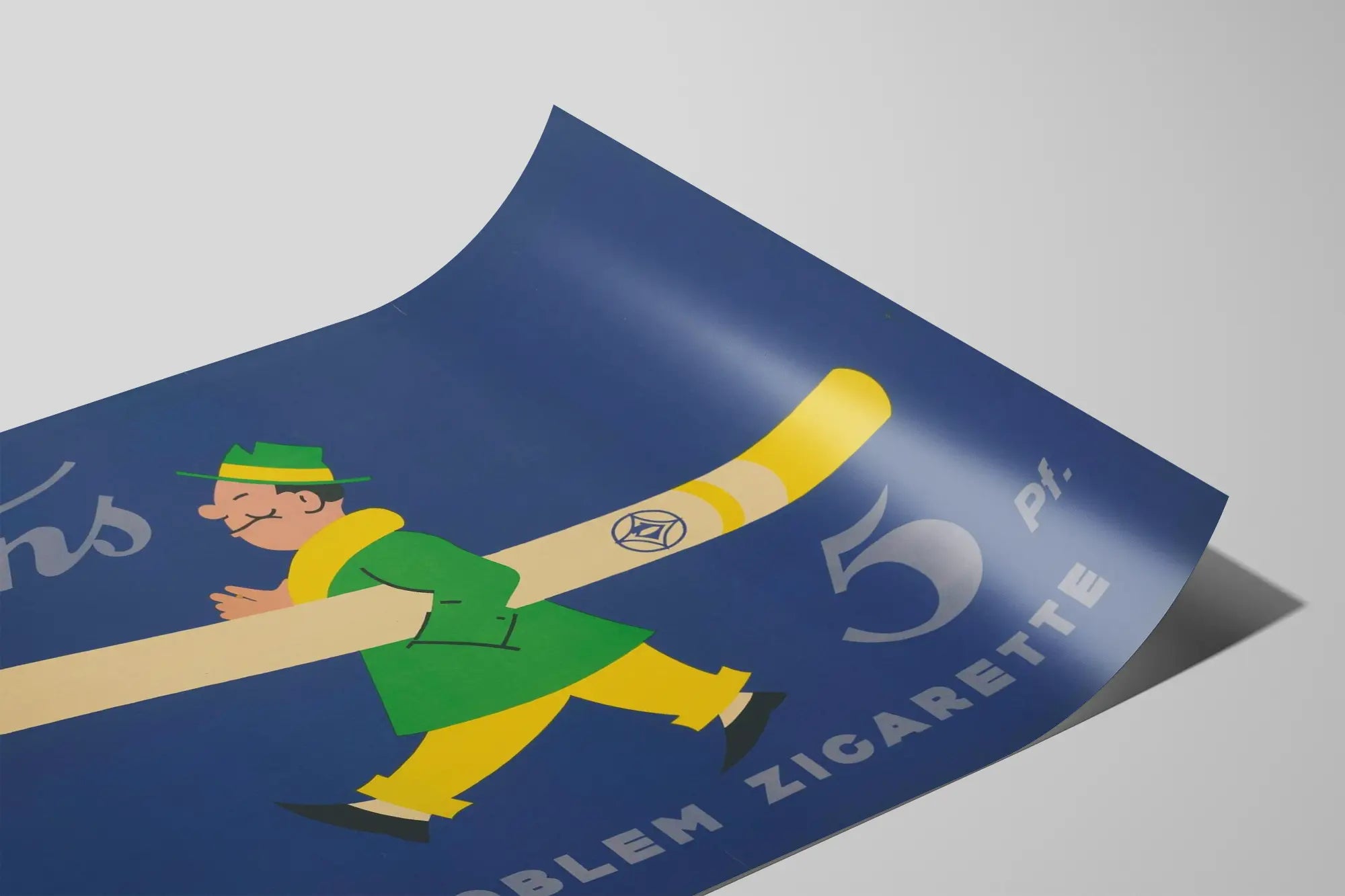 Dieses vintage-Werbeplakat zeigt eine stilisierte Figur, die eine große Zigarette auf der Schulter trägt, in einem klaren, farbenfrohen Grafikstil. Der tiefblaue Hintergrund schafft einen auffälligen Kontrast zu den leuchtenden Farben der Figur, die einen grünen Mantel, gelbe Hosen und einen passenden Hut trägt. Der Text „Trans“ und „Die Problem Zigarette“ ist in klaren Buchstaben gedruckt und verleiht eine sehr markante Retro-Visuelle Identität. Die Illustration erinnert an eine Werbeatmosphäre vergangener Jahre, perfekt für eine Wanddekoration, die einen Hauch industrieller Nostalgie und eine bekannte Vintage-Ästhetik vermittelt. Ideal als Poster fügt sich diese Wanddekoration charmant in ein modernes oder klassisches Interieur ein und verleiht Ihrem Raum einen einzigartigen und authentischen Akzent. Dieses Wandbild richtet sich an Liebhaber des Retro-Designs, alter Werbeplakate und schlichter, aber wirkungsvoller Grafik. Durch die Kombination kräftiger Farben und einer ausgewogenen Komposition wird dieses Plakat zu einem zentralen Element Ihrer Inneneinrichtung. Es eignet sich besonders für Wohnräume, Büros, Restaurants oder Räume, die der Vintage-Kultur und dem industriellen Stil gewidmet sind. Entscheiden Sie sich für dieses dekorative Poster, um eine charaktervolle Atmosphäre zu schaffen und die Geschichte der Werbung im Zusammenhang mit der Tabakbranche zu erzählen. Dieses Produkt ist eine großartige Geschenkidee für Liebhaber von Retro-Grafik und origineller Wanddekoration und bietet eine Wandgestaltung, die ins Auge fällt und zu einer authentischen Stimmung einlädt.
