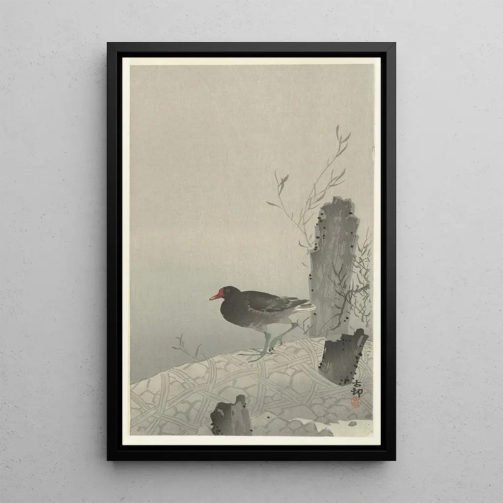 Die kunstdruck der Arbeit "Poule d'eau" entführt uns in eine natürliche Welt, in der Tier- und Pflanzenwelt harmonisch koexistieren. Diese zarte Darstellung des Vogels, der oft mit aquatischen Lebensräumen assoziiert wird, wird durch nuancierte Farben hervorgehoben, die das Licht auf subtile Weise einfangen. Die von Ohara Koson verwendete Drucktechnik ermöglicht es, jede Feder mit bemerkenswerter Präzision wiederzugeben, während sie gleichzeitig eine ruhige und kontemplative Atmosphäre schafft. Das Werk evoziert einen in der Zeit aufgehobenen Moment, in dem der Betrachter die einfache und authentische Schönheit der Natur schätzen kann.