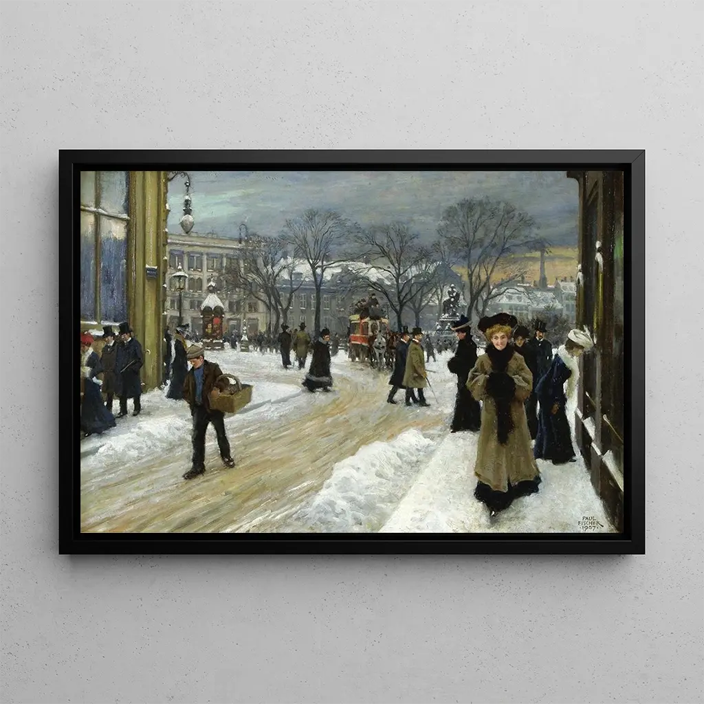 Jour d'hiver à Kongens Nytorv : eine städtische Szene unter Schnee "Jour d'hiver à Kongens Nytorv" von Paul Fischer fängt die Essenz eines kalten Tages in Kopenhagen meisterhaft ein, an dem der Schnee die Pflastersteine und die Silhouetten der Passanten bedeckt. Die weißen und grauen Töne dominieren die Leinwand und schaffen eine winterliche Atmosphäre voller Sanftheit. Fischer verwendet fließende Pinselstriche, um die langsam fallenden Schneeflocken darzustellen, während die architektonischen Details der Gebäude im Hintergrund eine historische Dimension zur Szene hinzufügen. Dieses Werk vermittelt ein Gefühl von Ruhe und Schönheit und lädt den Betrachter ein, in die friedliche Stimmung eines dänischen Winters einzutauchen. Paul Fischer : ein Meister der Genre-Malerei zu Beginn des 20. Jahrhunderts Paul Fischer, dänischer Maler, der Anfang des 20. Jahrhunderts aktiv war, ist bekannt für seine Szenen des Alltagslebens und seine Stadtlandschaften. Beeinflusst vom Impressionismus, konnte er Licht und Atmosphäre seiner Motive mit großer Sensibilität einfangen. Fischer hat oft Kopenhagen, seine Heimatstadt, dargestellt, und seine Werke spiegeln eine Übergangszeit wider, in der die Modernität zu beginnen schien. Sein einzigartiger Stil und seine Fähigkeit, Emotionen durch gewöhnliche Szenen hervorzurufen, machten ihn zu einem geschätzten Künstler, dessen Erbe in der Kunstwelt weiterlebt. Eine dekorative Anschaffung mit vielfältigen Vorzügen Der kunstdruck des Gemäldes "Jour d'hiver à Kongens Nytorv" ist eine dekorative Wahl, die Ihrem Interieur einen skandinavischen Charme verleiht. Ob im Wohnzimmer, Büro oder Schlafzimmer, diese Leinwand ruft die Schönheit der nordischen Winter in Erinnerung und schafft eine warme Atmosphäre. Die hochwertige Druckqualität garantiert, dass jedes Detail, von den Schneeflocken bis zu den historischen Gebäuden, wunderschön wiedergegeben wird. Durch das Hinzufügen dieses Kunstwerks zu Ihrer Dekoration bringen Sie ein Stück Geschichte und Kultur in Ihren Raum und wecken gleichzeitig die Bewunderung Ihrer Gäste.