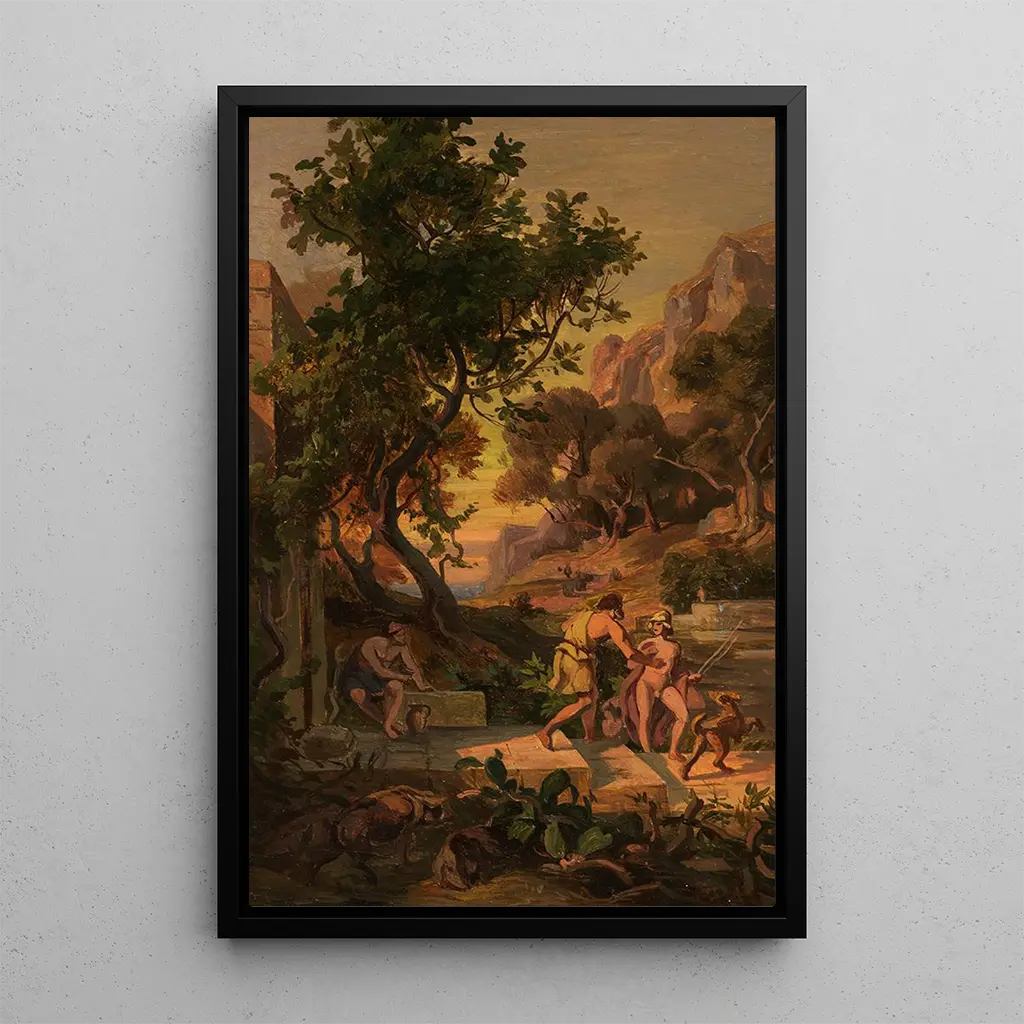 Friedrich Preller der Ältere, aktiv im 19. Jahrhundert, ist bekannt für seine Werke, die von Mythologie und klassischer Literatur inspiriert sind. Vom Romantizismus beeinflusst, verstand er es, erzählerische Elemente mit einer raffinierten Ästhetik zu verbinden. Seine Gemälde, oft von Melancholie geprägt, zeugen von einer Epoche, in der die Kunst danach strebte, tiefe Emotionen und epische Geschichten auszudrücken. Preller trug dazu bei, die Historienmalerei in Deutschland neu zu definieren, und sein Werk zum Cycle de l'Odyssée ist ein perfektes Beispiel für sein Talent, das kollektive Imaginäre einzufangen.